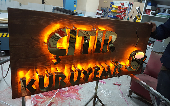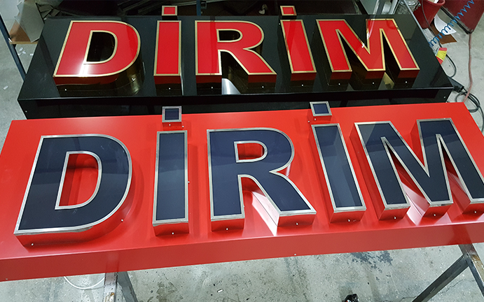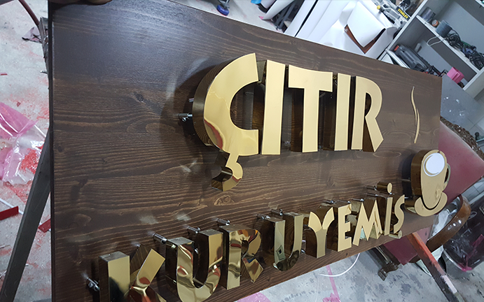 Paslanmaz kutu harflerin ön cephelerinde 304 kalitede 1,2 mm yüzeyinde paslanmayan saclar kullanılmaktadır. Tabela için yazılan harflerin ön kısımlarını lazer sistemi ve harflerin yan yüzeylerini giyotin makasları ile kesilerek hazırlanmaktadır. Paslanmaz kutu harf tabelaları istenilen renklerde boyanarak hazırlanmaktadır. Özellikle paslanmayan sac kullanıldığı için çok uzun süre kullanılabilir. Krom harf tabelaların yapımı tamamen el içliği olan tabelalardır. Üretimi yapılan tabelalarda ışıklı ve ışıksız sistem isteğe göre hazırlanmaktadır. Krom harf tabelalarda kullanılan krom malzemesi hem dayanıklı olması hem de temizlik açısından kolaylık sağlamaktadır.